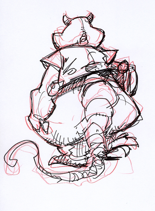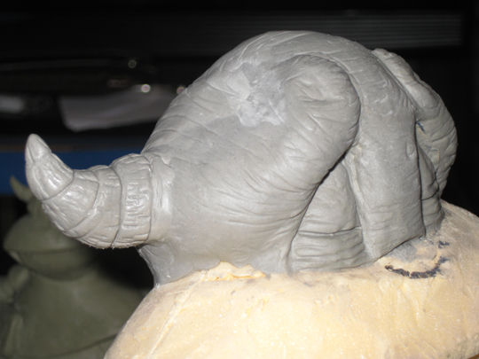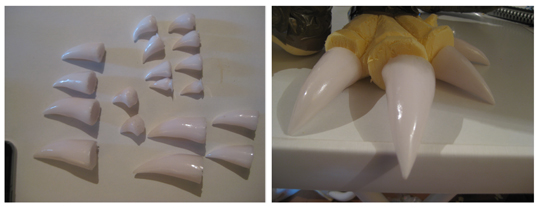 «Se modelaron en plastilina las garras de pies y manos, y los cuernos de los codos, para después sacar un molde de silicona de cada uno de ellos. Más tarde se vaciaron los moldes en resina de oclusión, cargada con carbonato cálcico, lo que hace que el acabado de las garras sea muy brillante y de aspecto córneo. Después se insertaron en la escultura».