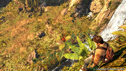 Y a las pruebas me remito: El Abismo de Oro, al igual que muchos pasajes de los otros Uncharted, te hacen brincar por plataformas con tal de mostrarte la puesta de sol (o la profundidad del barranco, o la magnificencia del bosque, o la belleza del riachuelo) que podemos admirar detrás mismo del lugar donde está teniendo lugar la, ejem, acción. Que los de Naughy Dog o Sony Bend han querido cargar las tintas más en lo secundario (los gráficos) que lo primario (un videojuego desafiante y divertido). Con dos cojones, así vamos a llegar lejos; añadamos a lo mencionado las características concretas -algunas de las cuales son las mismas que distinguen a Vita de otras máquinas de juegos- de El Abismo de Oro, jodedoras por sí mismas como el tener que equilibrar físicamente la consola para que el personaje que manejamos no se caiga del tronco por el cual está andando, o la abominable operación limpieza resuelta a base de pasar el dedico por la pantalla táctil a la cual obligatoriamente tenemos que someter muchos objetos que en el juego encontramos. Que sí, que sí, ¡que hay que utilizar la tecnología de Vita para hacer un juego diferente! Pero eh: como esos machetazos que nos abrirán el camino (acertaron: nuevamente, a restregar el dedazo por la pantalla), o la falta de precisión que añade al control tradicional, el tener activo en todo momento y al mismo tiempo el control por movimiento: apunten y disparen ustedes a los malosos con los analógicos y los botones, sí, pero asegúrense de que no mueven la consola lo más mínimo o fallarán el tiro por muy precisos que hayan sido apuntando.