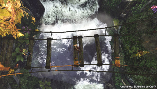 En primer lugar, como apuntaba arriba no soporto los juegos-espectáculo en los que hay más espectáculo que juego. Cuántas veces habrán oído ustedes comentar a las novias –no precisamente jugadoras- de sus amigos, que no solo conocen alguno de los títulos de la serie Uncharted sino que además les gusta «ver jugar a Uncharted». Lógico: es esta una saga peliculera como pocas, llena de situaciones argumentales supuestamente espectaculares que se han traducido a lo visual con mayor o menor brillantez. Ahora bien, y aquí es donde viene el problema: eso no sería un mal per se si la parte lúdica, la parte interactiva acompañara. No es el caso: la serie, en general, está llena de momentos en los que debemos escalar plataformas de la que es imposible caerse. Y qué me dicen de los tiroteos: reconozco que me divertí con los primeros escopetazos dados mientras buscamos cobertura en el primer Uncharted. Pero esa parte buena de estos juegos se ha ido perdiendo al concederse mayor protagonismo al uso y abuso de la plataforma inane, del espectáculo por el aburrido espectáculo, provocando que yo haya extraído de estos datos la siguiente conclusión: A los de Naughty Dog –desarrolladora de los títulos de la serie creados para PS3-, como a Sony Bend –perpetradores de este Abismo de Oro– les interesa más perderse en la tecnología, hacer I + D para crear graficazos con los que ofrecer espectáculo (tostonesco) que en emplear esa misma tecnología para inventar maneras por las cuales el usuario se divierta jugando.